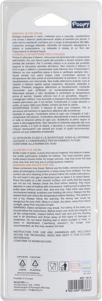 Il Biberon Poupy in vetro puro e naturale per neonati da 230 ml è perfetto per l'idratazione in sicurezza dei tuoi figli.