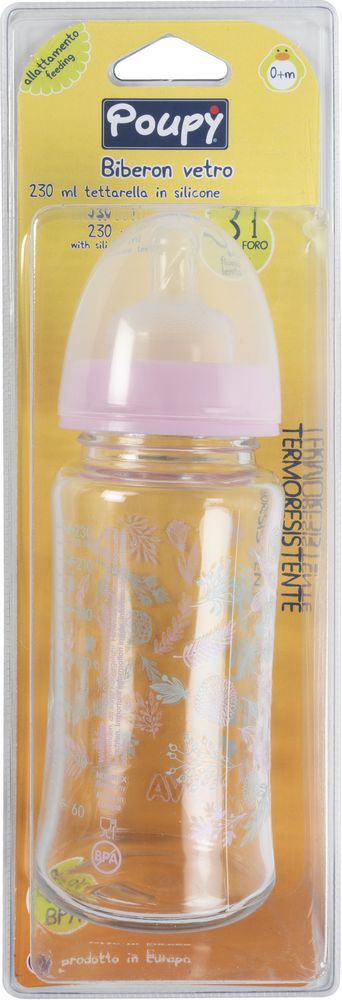 Il Biberon Poupy in vetro puro e naturale per neonati da 230 ml è perfetto per l'idratazione in sicurezza dei tuoi figli.