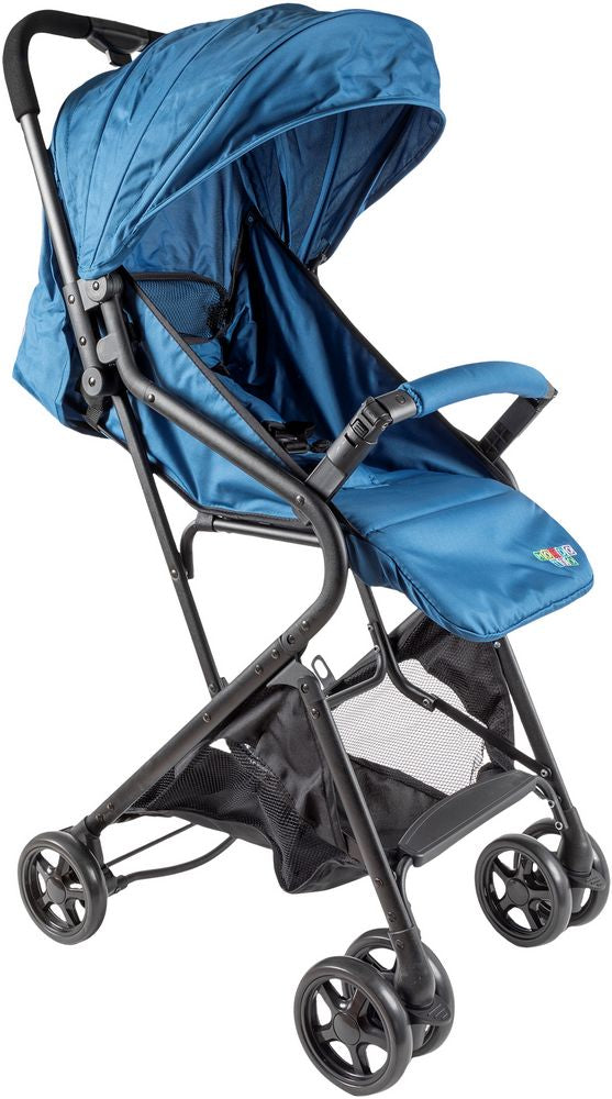 Questo passeggino blu ha uno schienale reclinabile per la comodoità del bambino e un sistema frenante per qualsiasi evenienza.