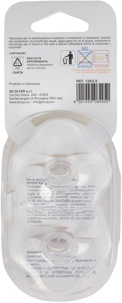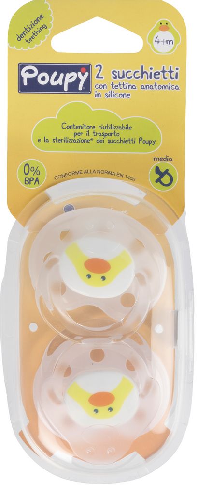 Il Succhietto Poupy Anatomico 2 pezzi per bambini in morbido silicone con una tettina che non si deforma anche a seguito di sterilizzazioni.